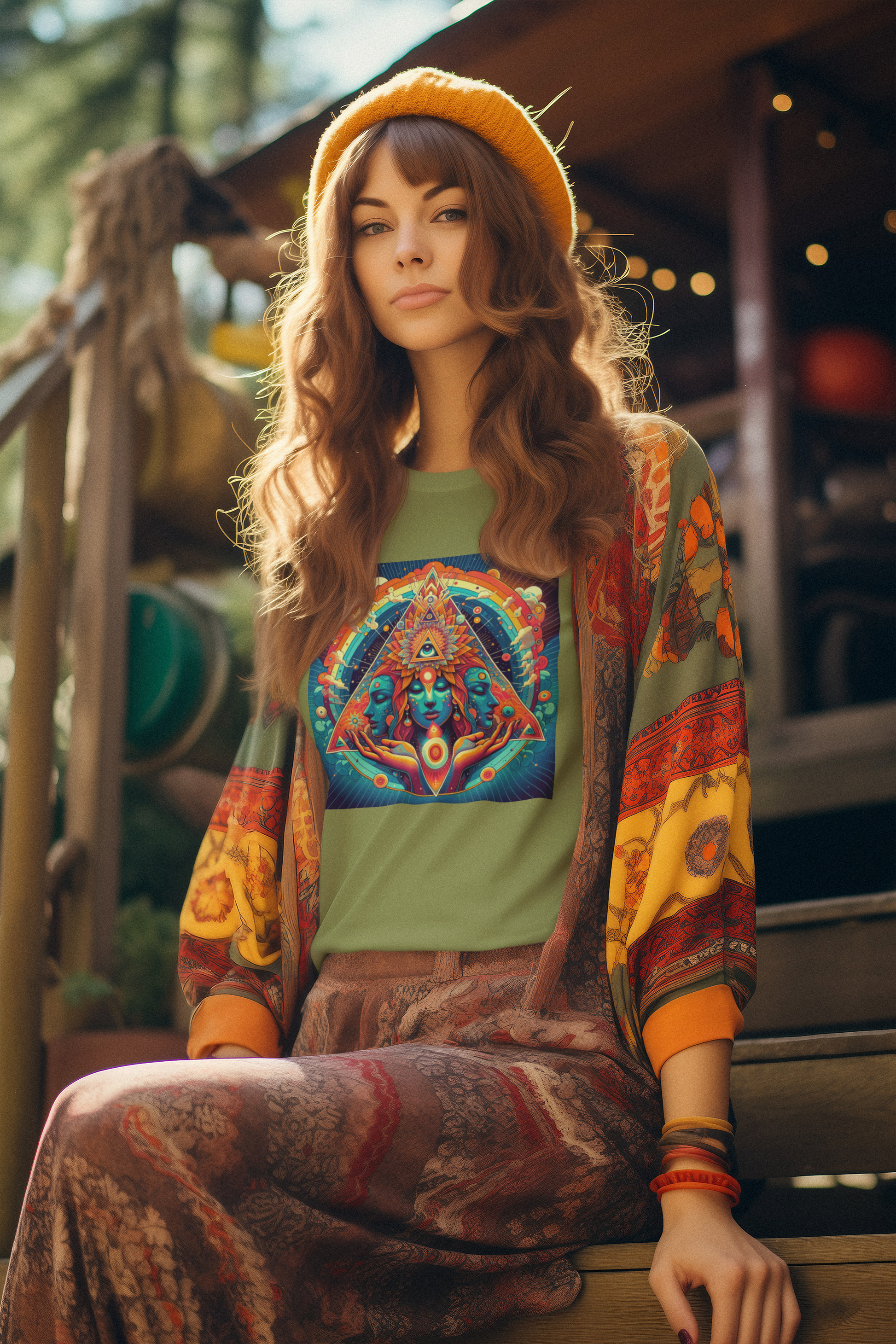 5D Hippy T-Shirt representing the symbol for consciousness in the fifth dimension. This tee gives off a spiritual and whimsical vibe, perfect for those interested in metaphysical concepts and cosmic consciousness. Ideal for wearing to spiritual gatherings, music festivals, and yoga retreats.