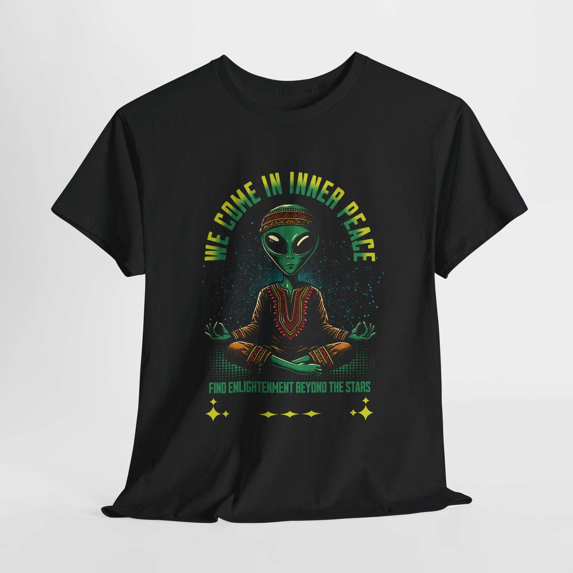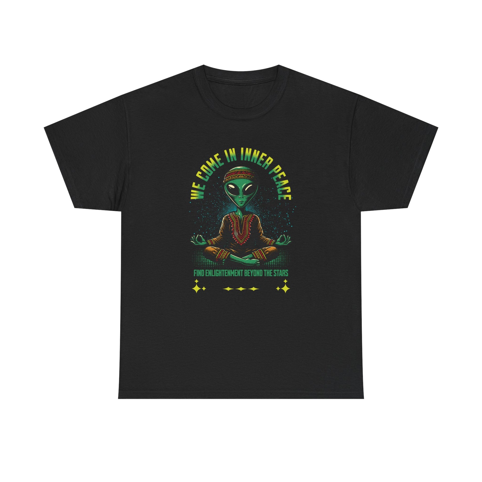 The WE COME INNER PEACE ALIEN tee exudes a cool, quirky vibe perfect for the sci-fi enthusiast or UFO believer. This heavy cotton tee offers year-round comfort and durability, making it a great addition to any casual wardrobe. Ideal for adults, this tee is made with high-quality materials and features unique printing techniques for crisp, detailed designs.