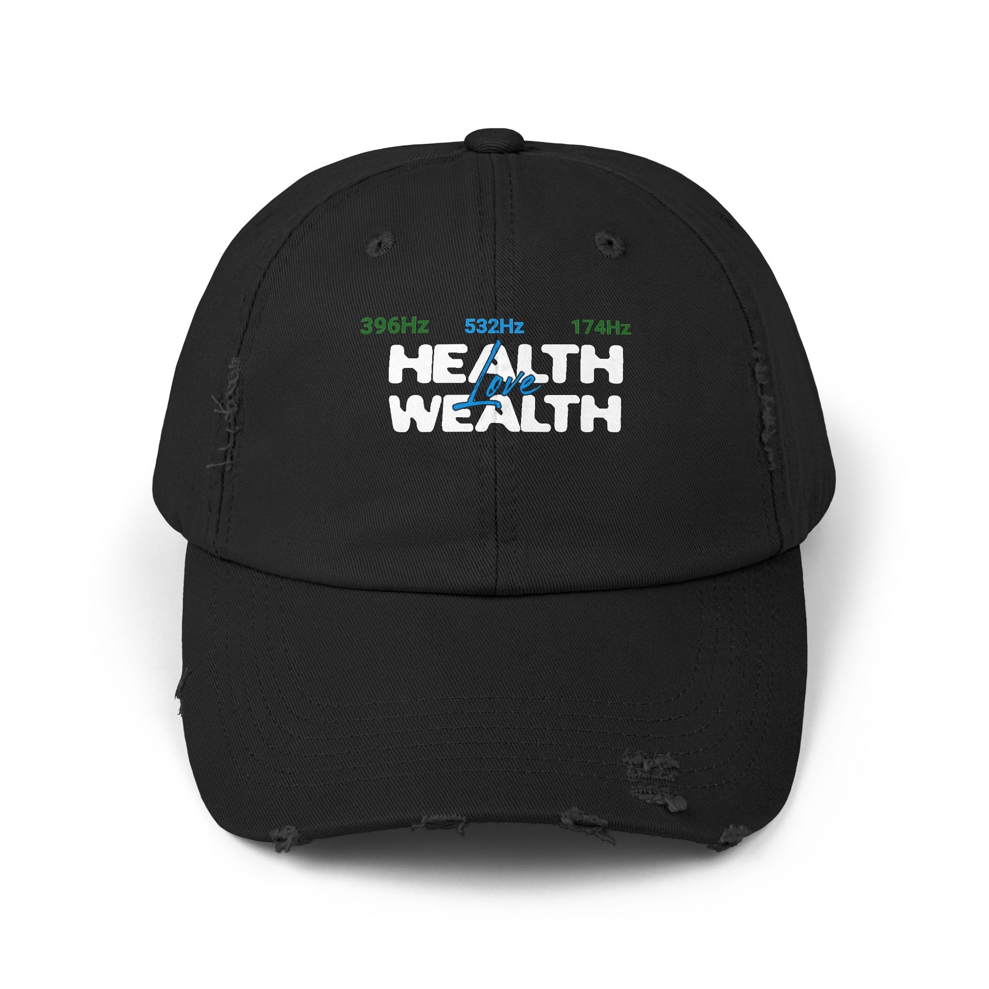 Discover our Health Wealth & Love hat crafted from 100% cotton twill for ultimate comfort and durability. Featuring a custom distressed design with matching frequency hz, it includes a low profile, D-ring closure for sun protection and an adjustable fit. Printed using Direct to Film (DTF) technology, it ensures style and practicality while noting possible variations in distress and color due to the finishing process.