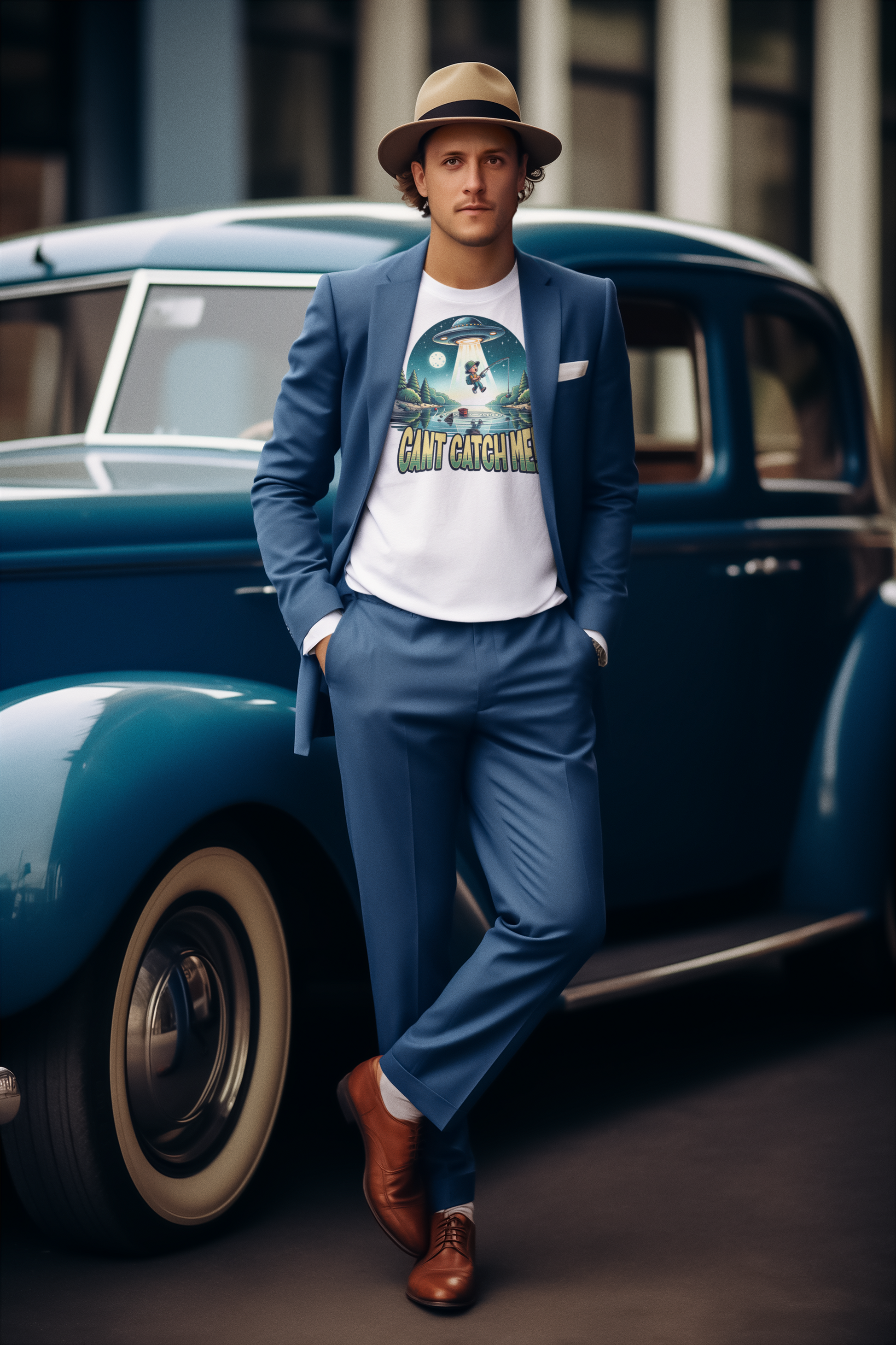 Introducing our whimsical Fisherman and Alien Spaceship t-shirt, crafted from 100% Airlume combed and ring-spun cotton (4.2 oz/yd²). This classic unisex tee combines whimsy with a touch of the extraterrestrial, featuring a humorous scene where a fisherman casts his line beside a tranquil pond, oblivious to the hovering alien spaceship above. The artwork delights with its playful depiction and is adorned with the statement "Can't Catch Me," adding humor and defiance to the narrative.